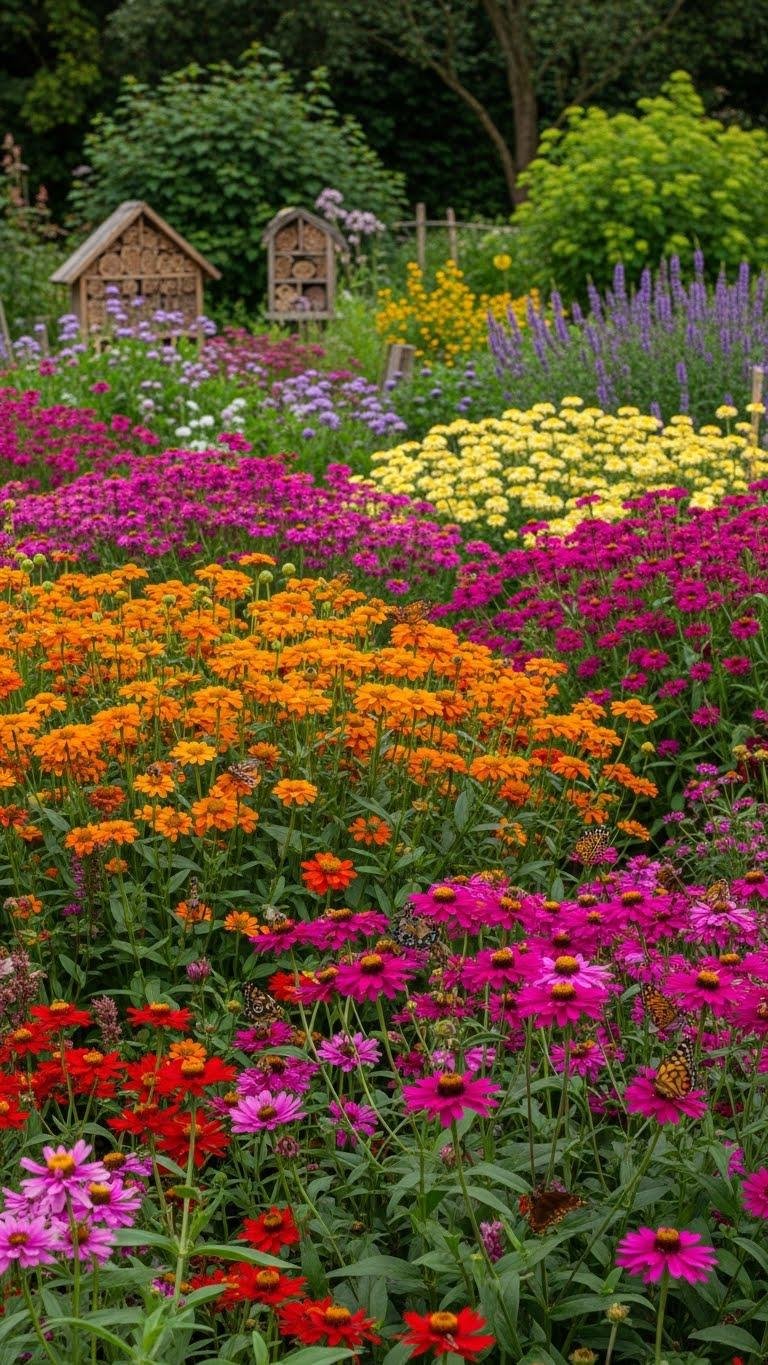 Combine massed plantings with bee hotels, staggered bloom times, and light maintenance to keep your garden free and thriving.