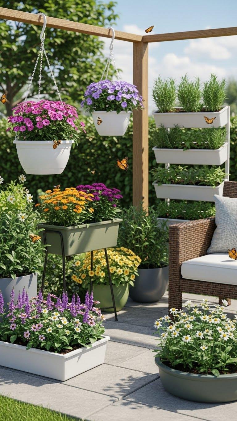 You can mix hanging planters, shallow trays and vertical herbbeds to maximize blooms. Choose native, nectar-rich plants, provide sun, and rotate containers for bloom succession—then sit back and watch bees and butterflies find freedom.