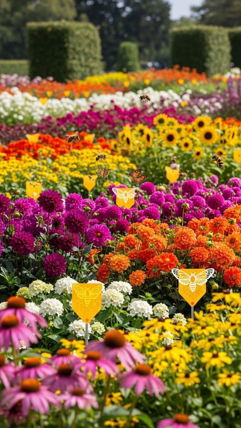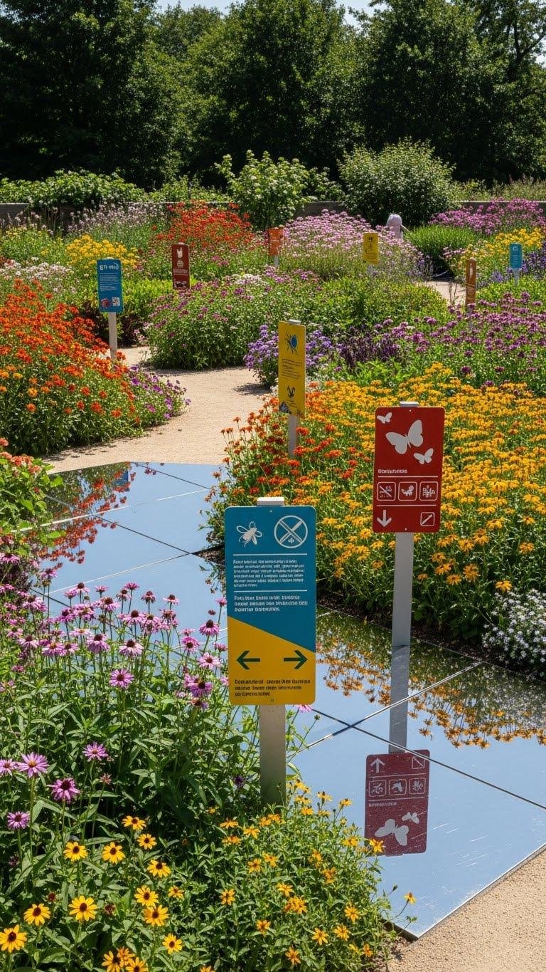 Use bold color blocks, grouping blooms into big masses, and add subtle bright signage or reflective markers to guide bees and butterflies from a distance. You’ll make navigation easy while keeping your design natural and free.