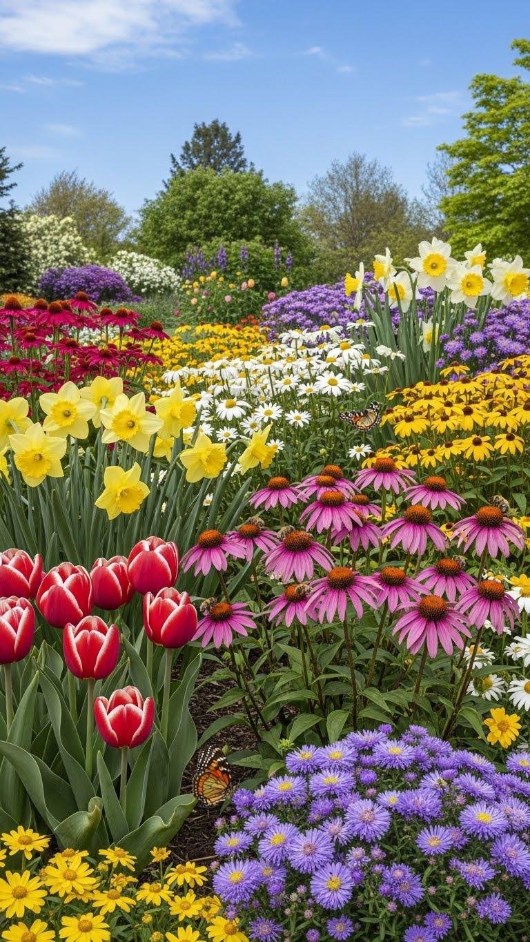 You’ll use seasonal succession and smart bloom scheduling to choose early bulbs, midseason perennials, and late asters.