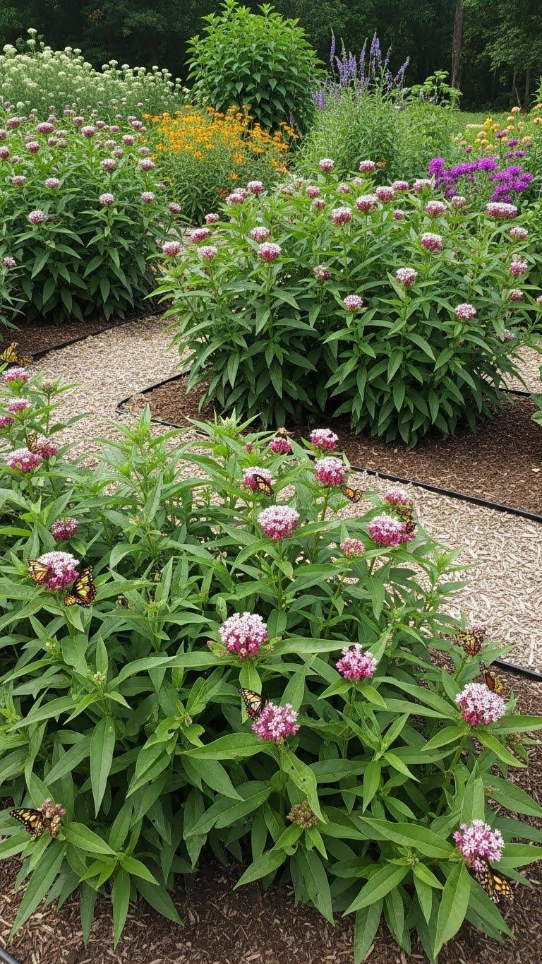 Group milkweed and nectar plants into clumps at least 3 feet (1 meter) across so butterflies can easily find and use them. Arrange beds to suit your space and freedom to roam, improving soil composition with compost and minimal disturbance.