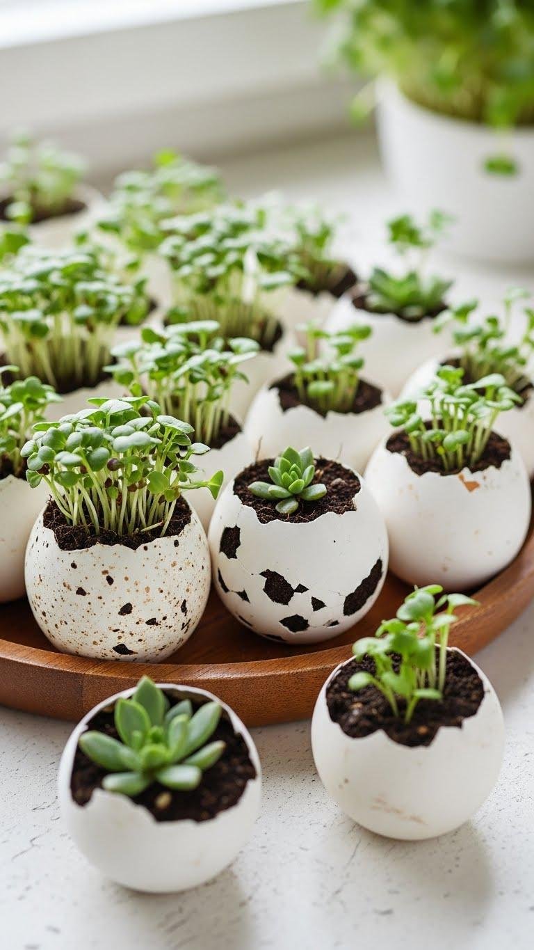 Often overlooked, eggshells make excellent mini planters for seedlings and succulents because they’re naturally porous, compostable, and perfectly sized for starting roots. You can crack clean halves, fill with soil, and plant microgreen starters or tiny succulents. Arrange shells into decorative eggshell mosaics or nest them in a tray. They’re portable, biodegradable, and let you transplant seedlings with minimal root disturbance.