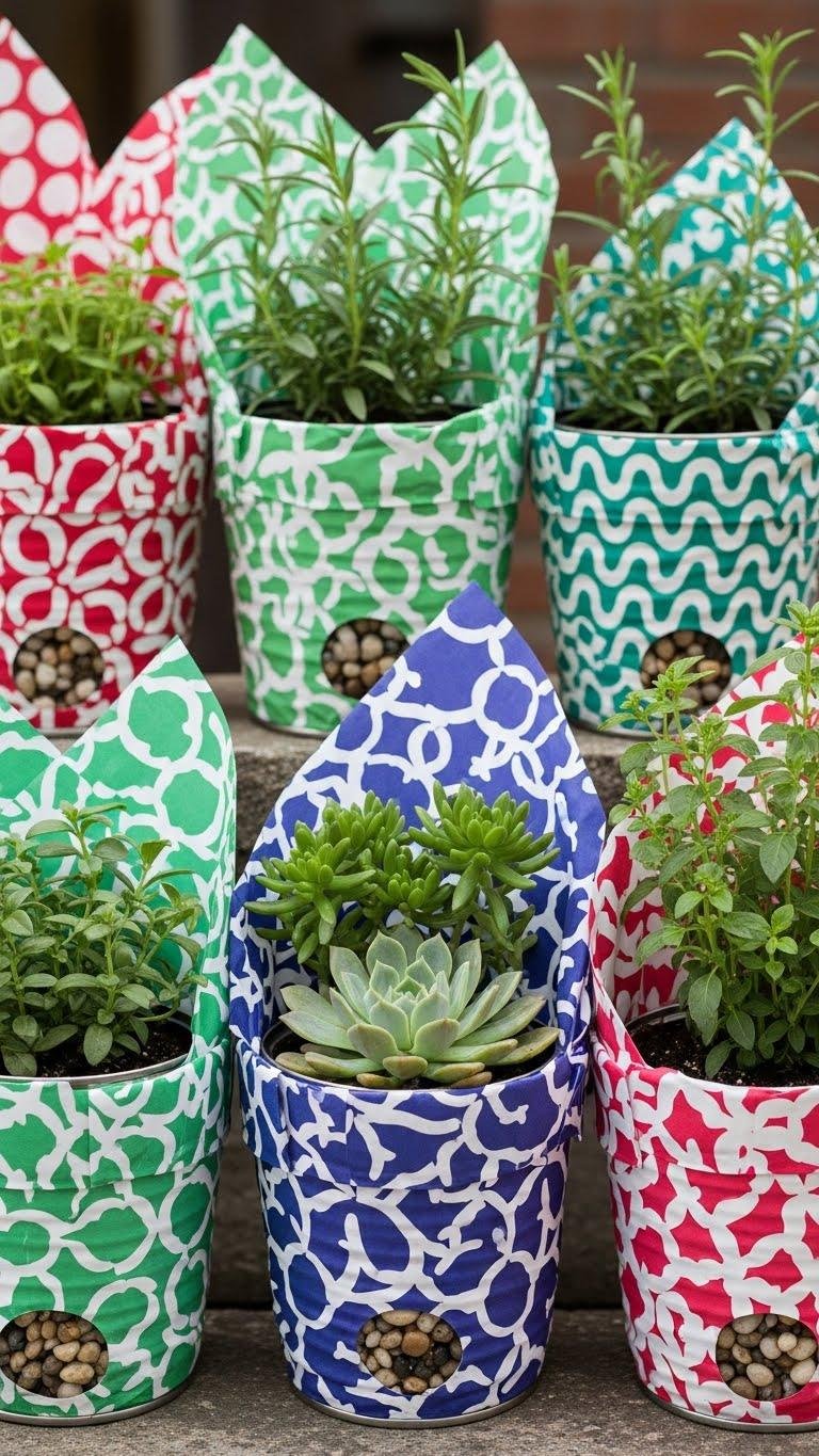Wrapped in colorful gift paper, covered tin pots turn ordinary cans into stylish, durable planters you’ll want to display. You’ll prep tins, seal edges, and use simple gift wrapping techniques to weatherproof surfaces.