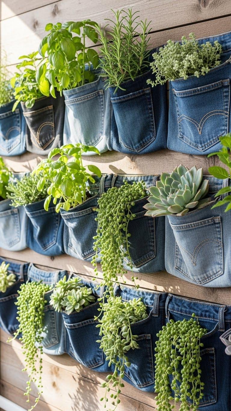You can take the same upcycling spirit from covered tin pots and turn old jeans into a space-saving fabric garden: denim pocket vertical planters let you hang herbs, succulents, or trailing plants on a wall or fence using the sturdy back pockets as mini pots.