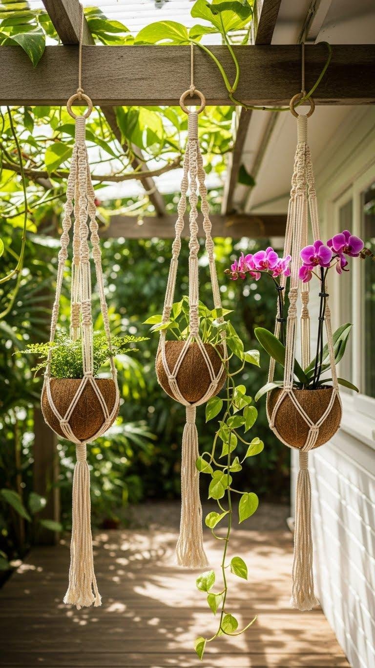 Bring a tropical, handmade touch to your porch with macramé coconut hangings that pair natural fibers with hollowed coconut shells for instant character and drainage.