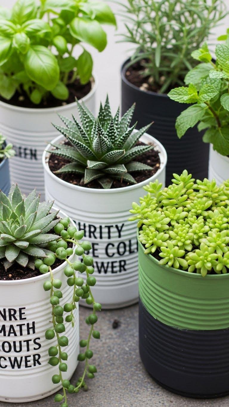 Hang cans with sturdy twine or chains, mix herbs or succulents, and attach beads or small bells to create upcycled windchimes. You’ll craft freedom, utility, and charm.