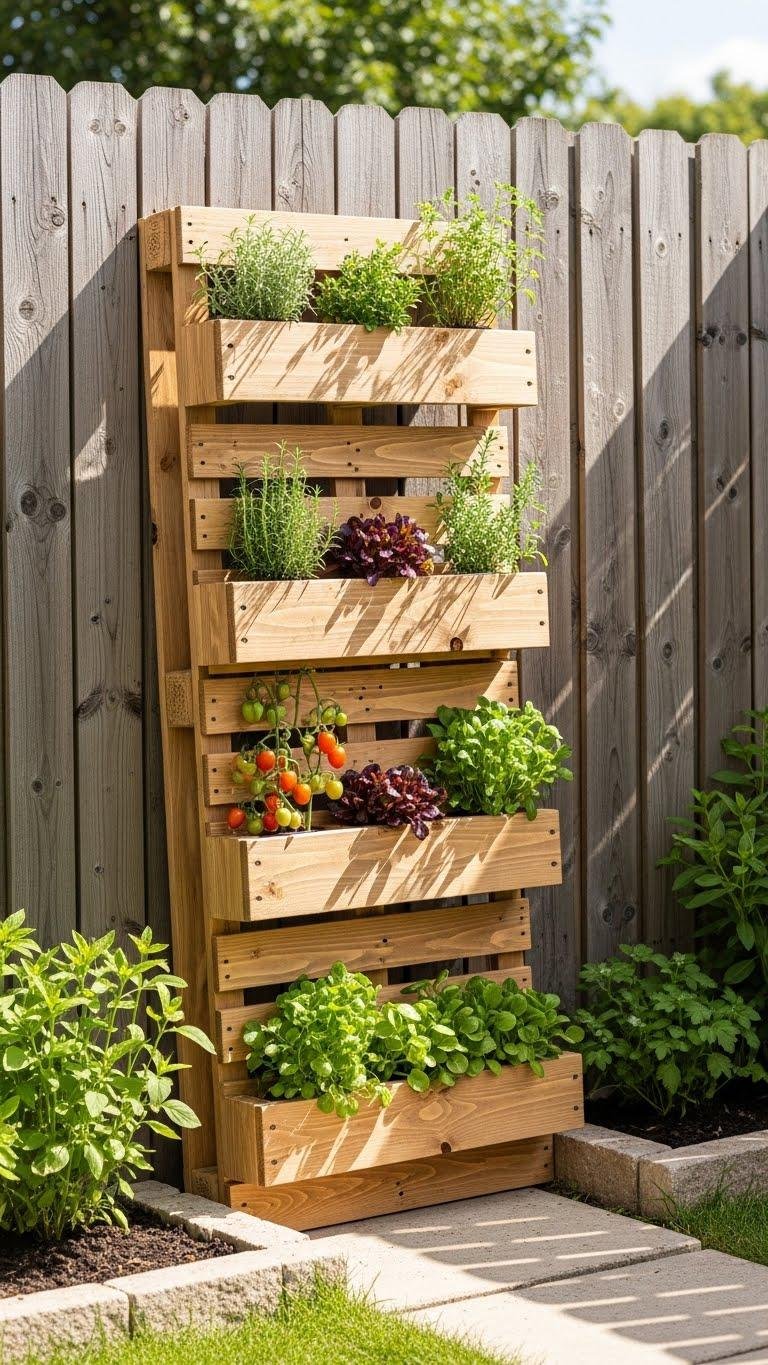 Built from a single reclaimed pallet, a vertical garden stand turns small spaces into productive green walls you can hang or lean against a fence.