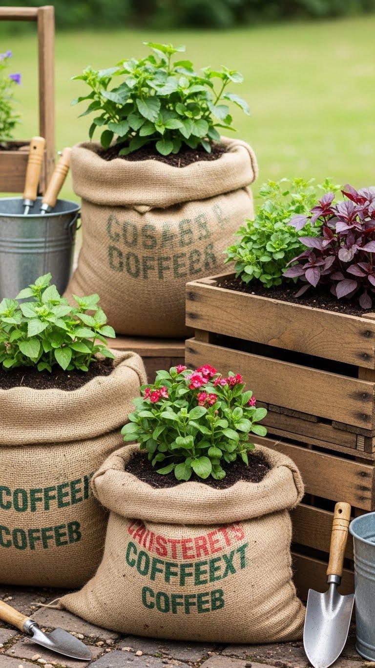 If you liked the rustic look of colanders and buckets, burlap coffee sacks and wooden crates offer a similarly weathered charm but with softer, more flexible options for containing soil. You’ll line sacks to retain soil, drill crate drainage, and mix potting soil with compost.