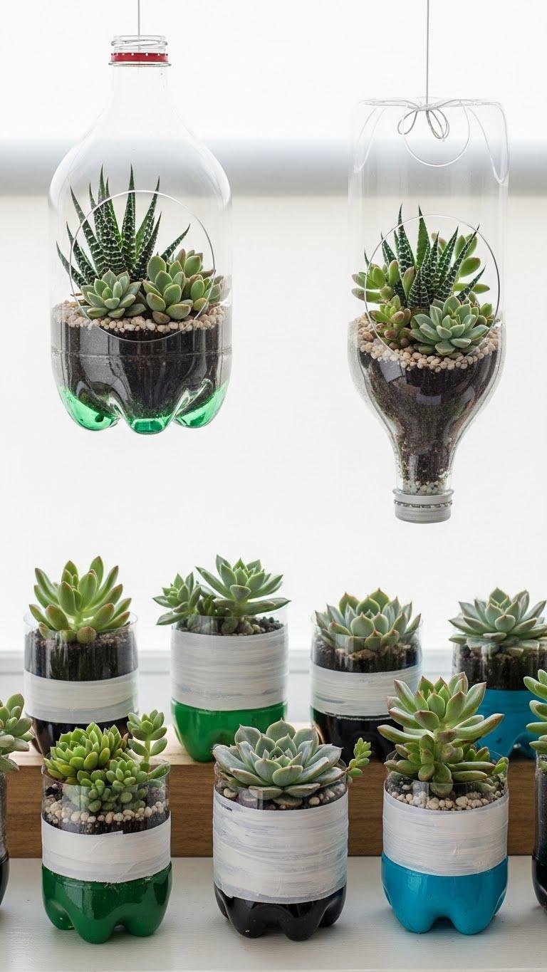 Cut bottles to create shallow containers, add drainage gravel, cactus mix, and small succulents.