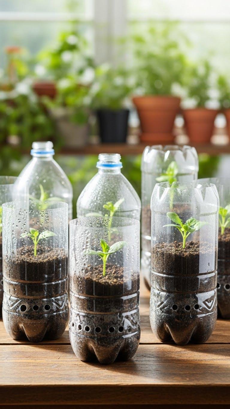 When you cut down plastic bottles to create mini greenhouses, they turn fragile seedlings into resilient starters by trapping humidity and warmth without taking up much space.