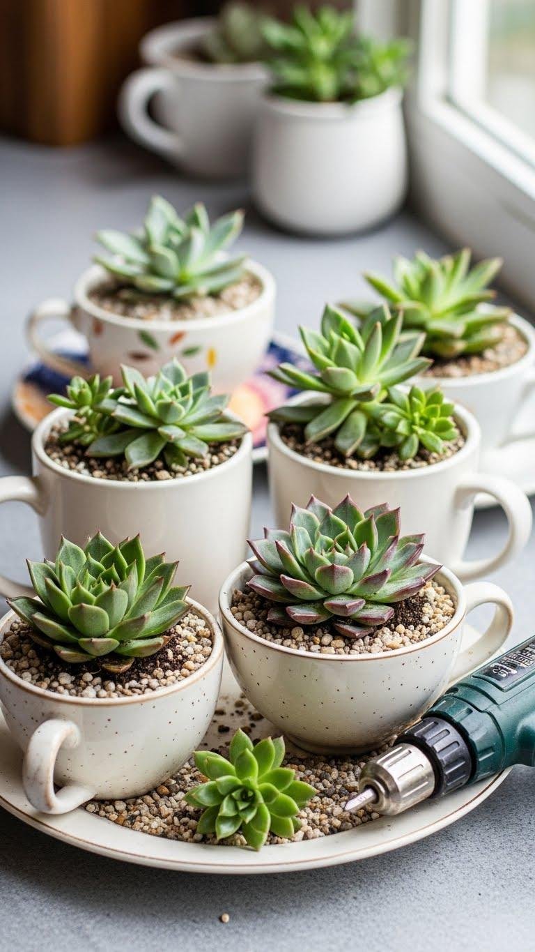 Looking for a charming way to display succulents in small spaces? Use teacups or mugs with a vintage saucer for balance; drill a tiny drainage hole or layer gravel to prevent rot.