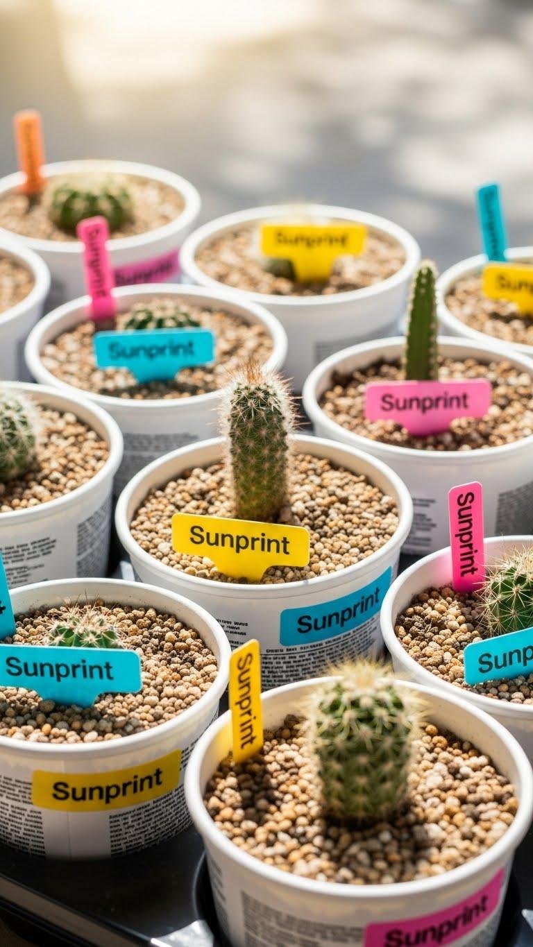 You’ll sterilize tubs, add drainage, and fill with gritty mix. Use DIY scoops to portion soil, label each pot with Sunprint labels for sun-safe ID, and position tubs for airflow. You’ll save money and keep care simple.