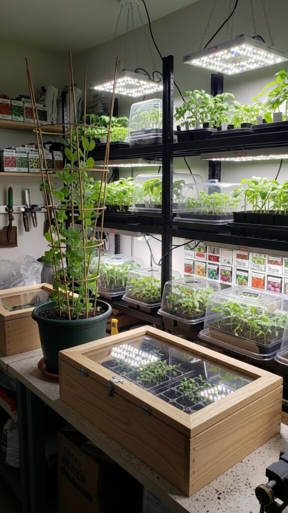 If you want reliable, year-round starts, build simple structures—cold frames to capture low sun and warmth, trellises to save space and improve airflow, and basic indoor lighting to get seedlings strong before they go outside.