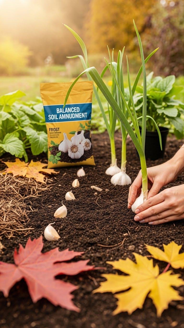 You’ll space cloves properly, add a balanced soil amendment, mulch for frost protection, and use companion planting to deter pests.