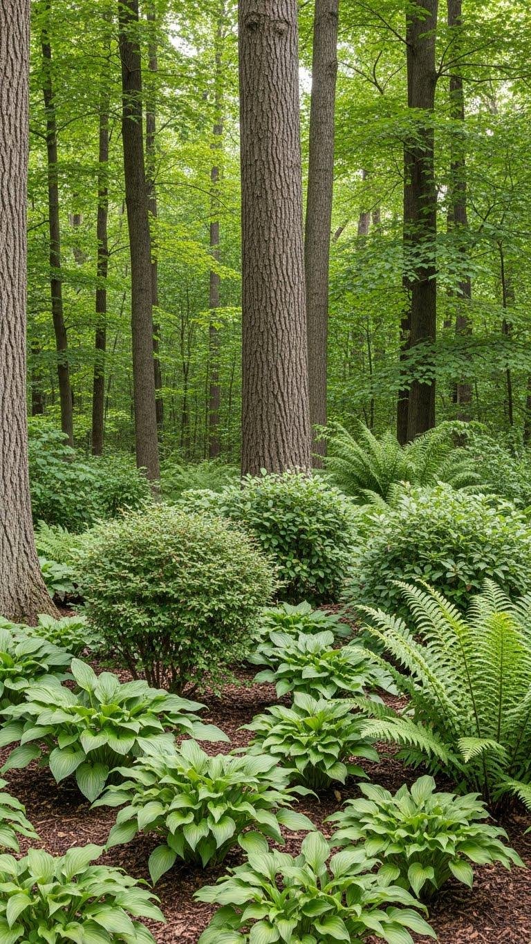 When you design a woodland layer with ferns and hostas, think in vertical bands: tall canopy trees, a midlayer of shrubs, then a lush groundcover of hostas punctuated by ferns.