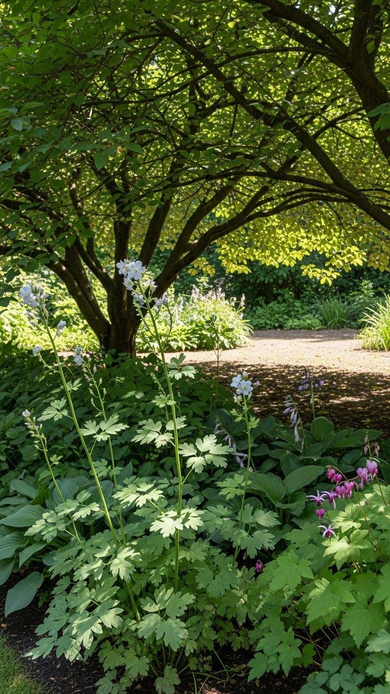 Siting Jacob’s ladder (Polemonium) beneath deciduous trees takes advantage of the cool, dappled light it prefers and lets you layer delicate, fern-like foliage under shifting canopy shadows.