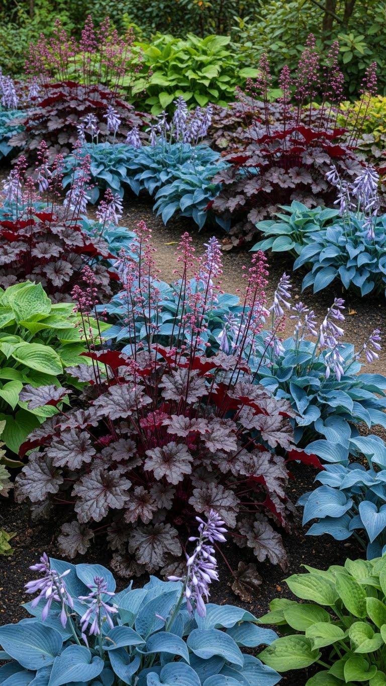 Bold Foliage Contrast With Obsidian Heuchera and Blue Hostas