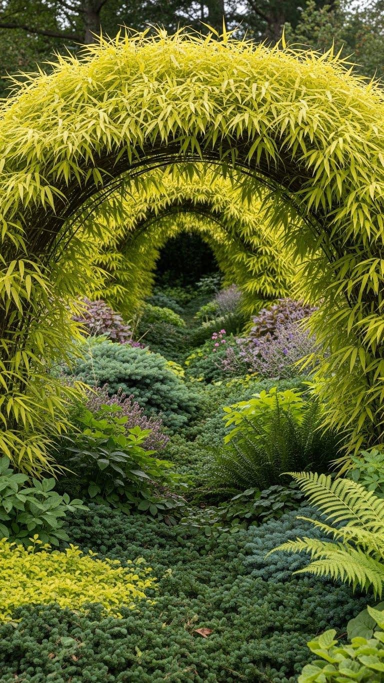 Moving from the layered shrub-and-perennial edge, guide visitors along a shaded path framed by Golden Japanese forest grass (Hakonechloa macra ‘Aureola’), whose arching, bamboo-like blades brighten dim corridors with soft, chartreuse color.