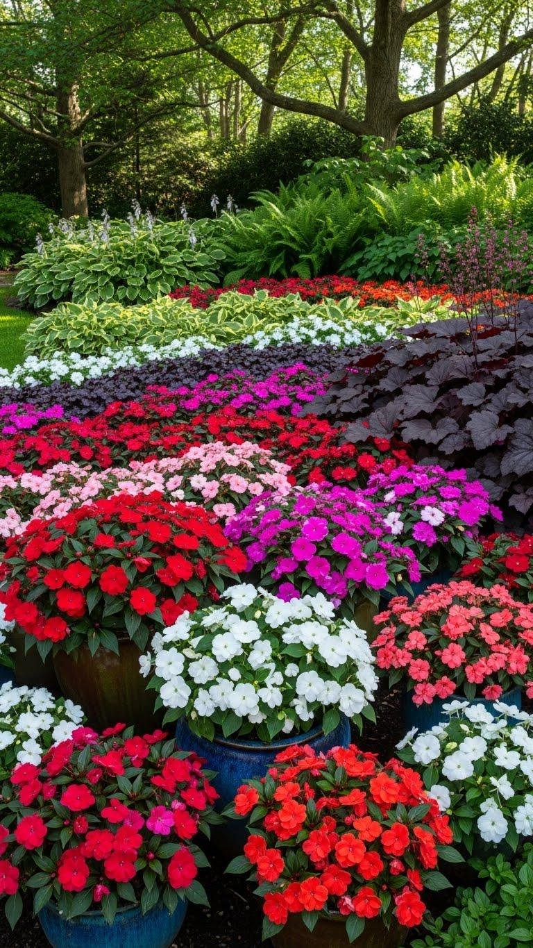 Often you’ll rely on low-maintenance annuals like impatiens to punctuate shade beds with repeatable bursts of color; plant them in drifts, containers, or at bed edges so the same hue recurs through sightlines and ties the space together.