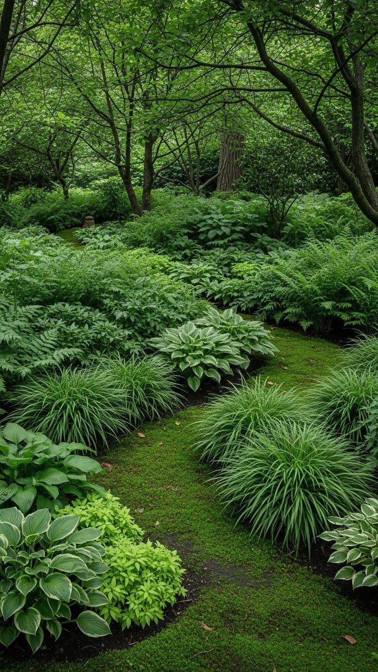 Embracing monochrome green massing under trees creates a calm, cohesive understory that lets texture and form do the work, so you don’t rely on flashy blooms to define the space.