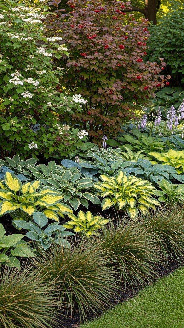 You’ll get strong textural contrast and clear sightlines. Place viburnums for structure, hostas for foliage mass, and sedges to soften the turf edge.