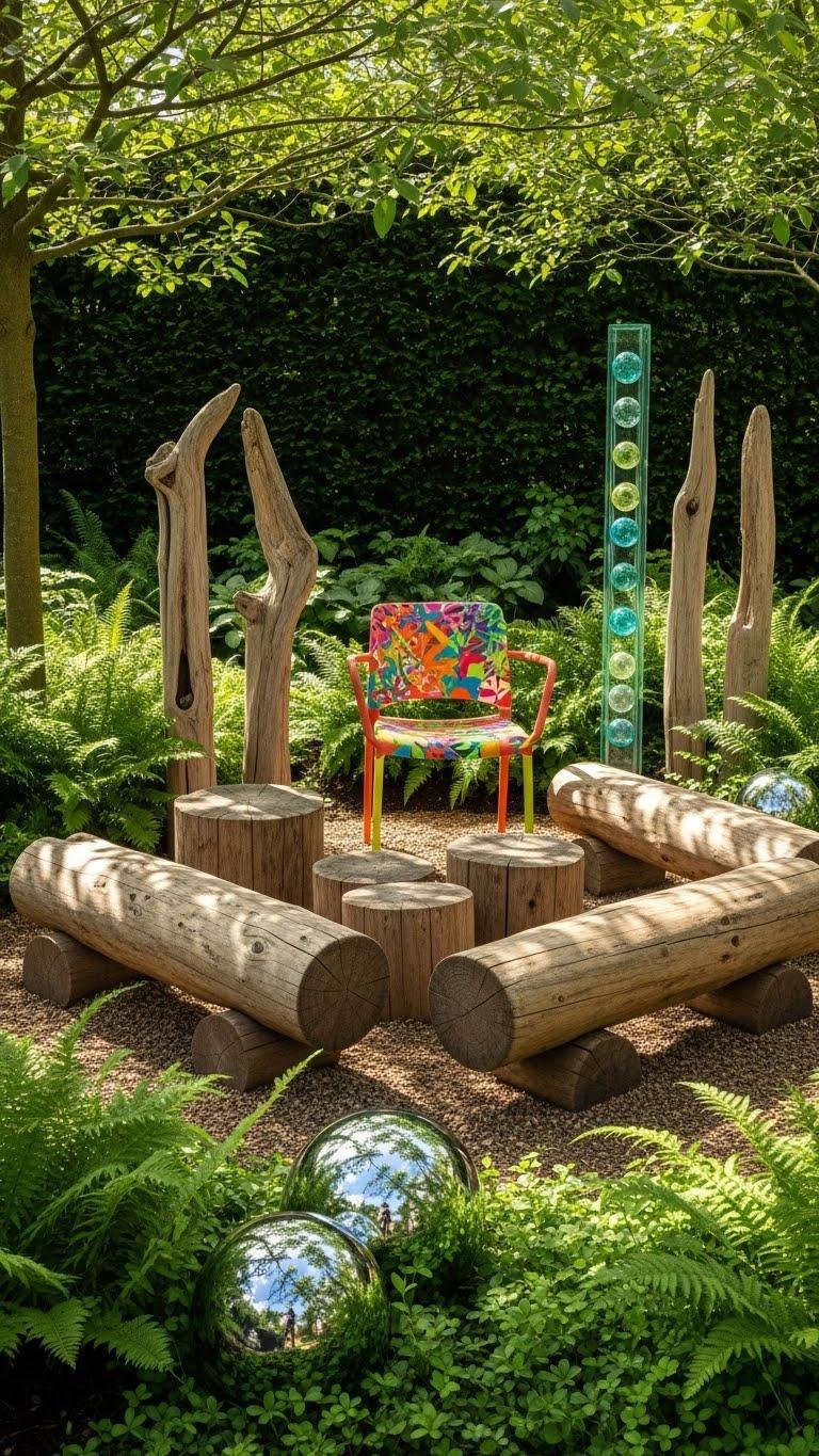 Add playful accents to punctuate shady beds and guide the eye: a cluster of low logs creates seating and habitat, a lone painted chair offers a focal pop, and a vertical glass totem catches dappled light.