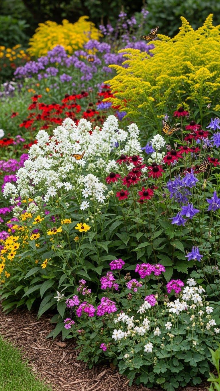 Design pollinator pathways through a native understory of foamflower, goldenrod, and columbine.