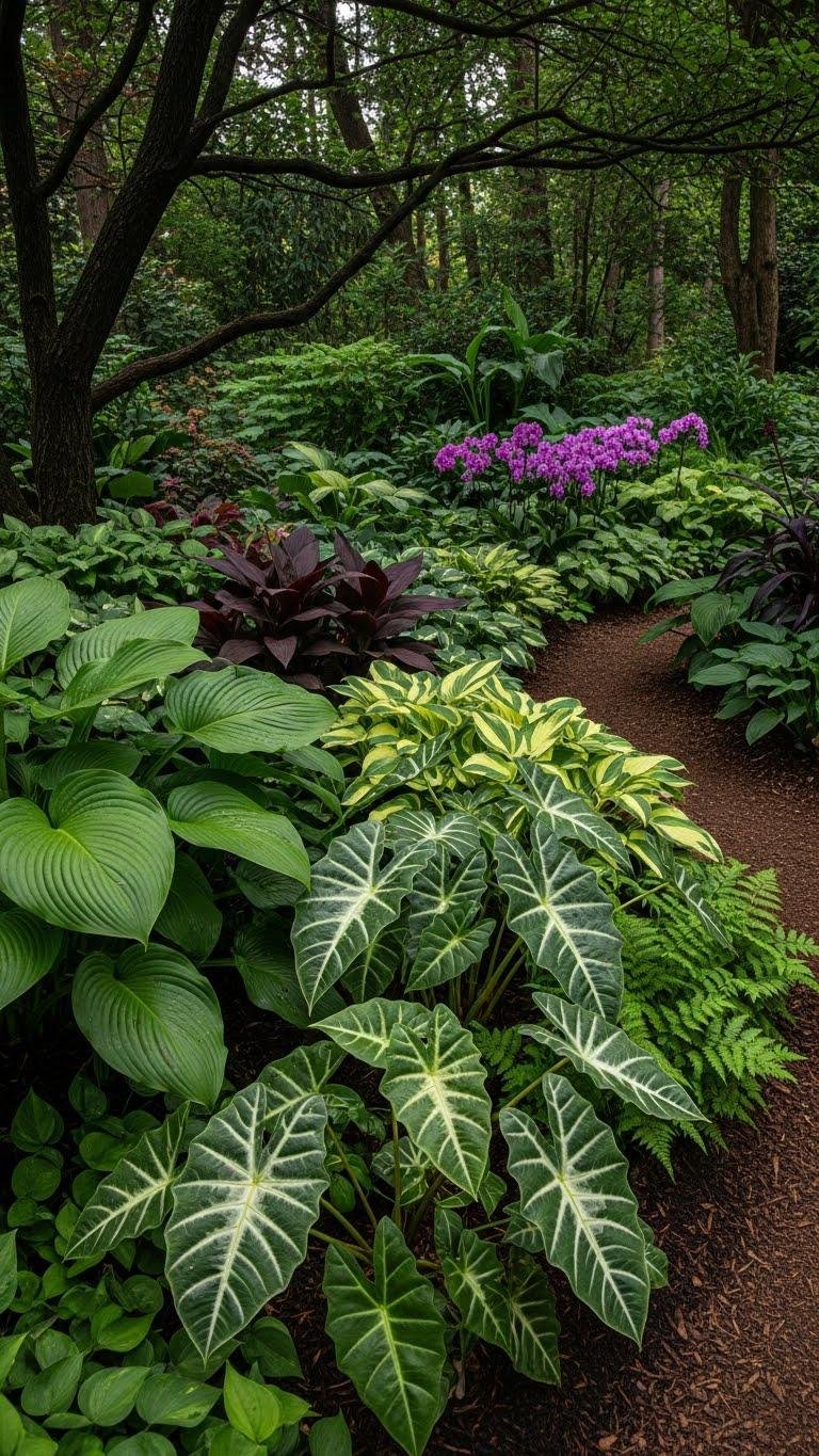 You’ll choose a tropical palette of large-leaf hostas, ligularias and variegated colocasias, then tuck shadow orchids and ferns into pockets of filtered light.