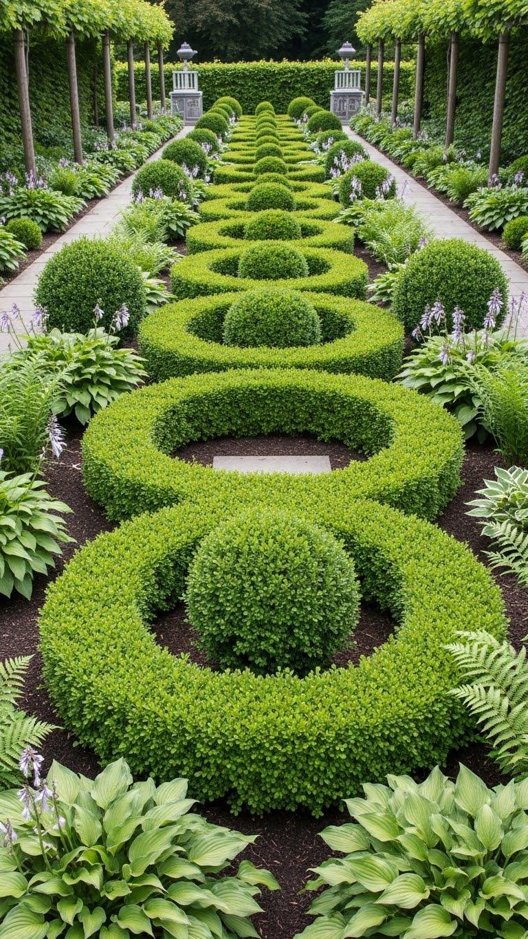 You’ll choose durable perennials and foliage shrubs for symmetrical planting, repeat circles or rectangles with boxwood, hosta, and ferns, and use geometric repetition to guide movement. The result feels controlled yet freeing.