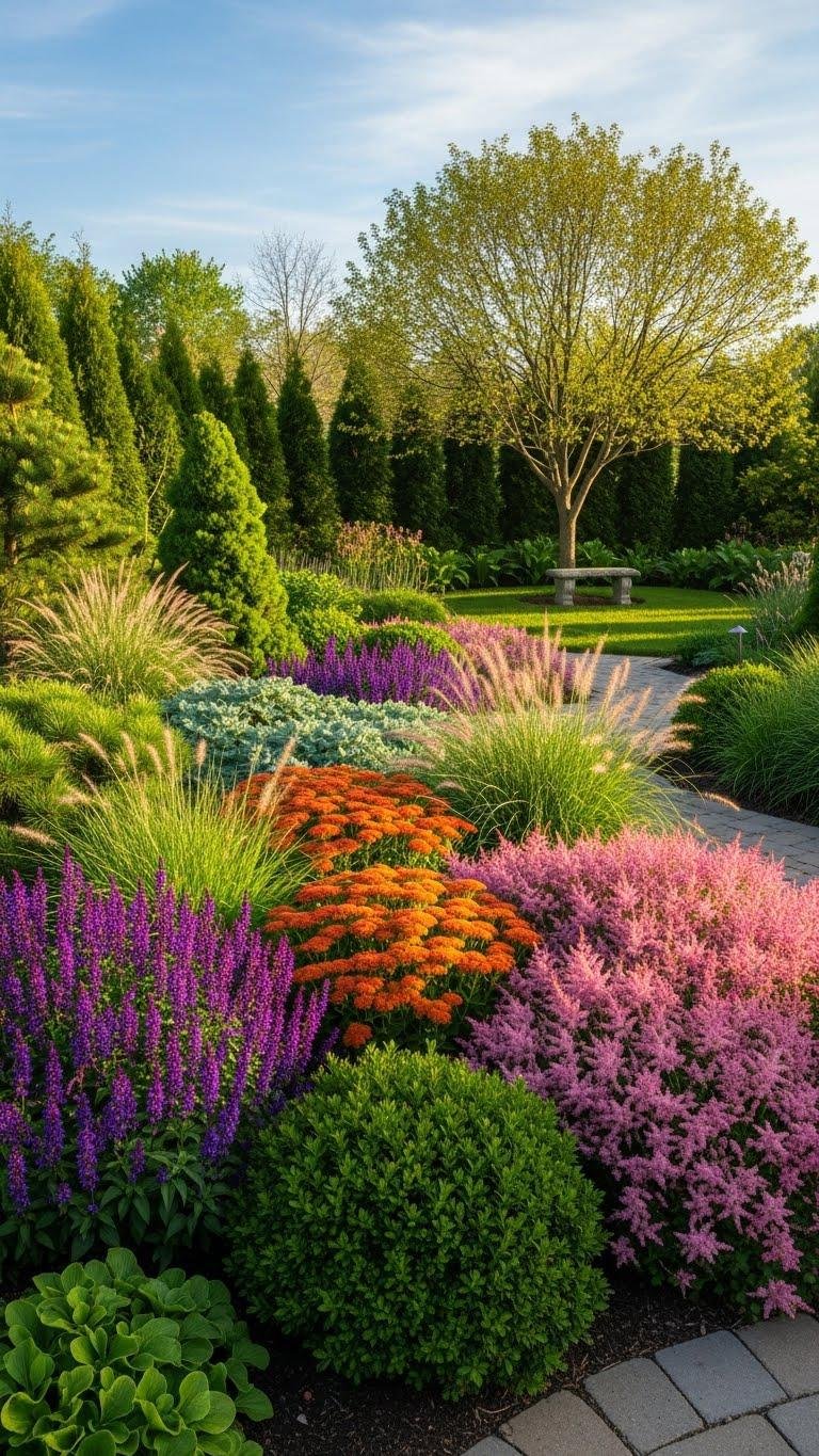 Having reliable evergreens and sculptural grasses in place makes it easier to repeat a few key plants in sweeping drifts that tie the whole plot together.