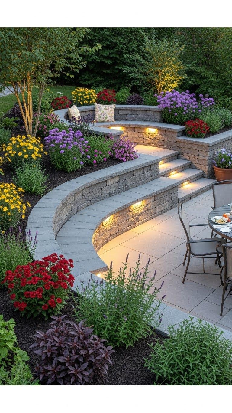 You’ll use a low wall as a curved bench or step seating, framing bold perennials and herbs.