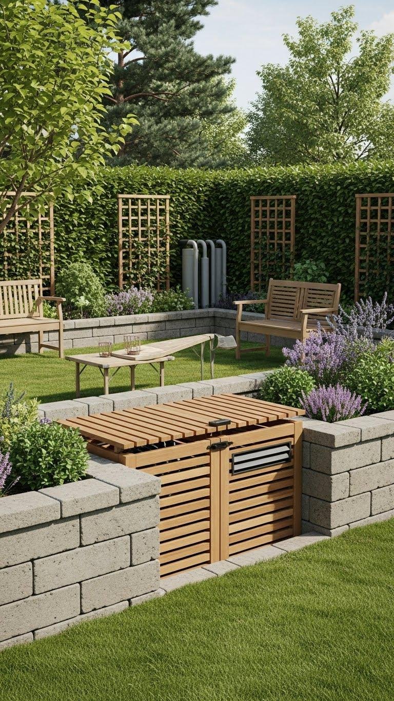 You’ll use hidden hinges for smooth lift-up lids and a cushioned ledge for lounging among herbs and grasses.