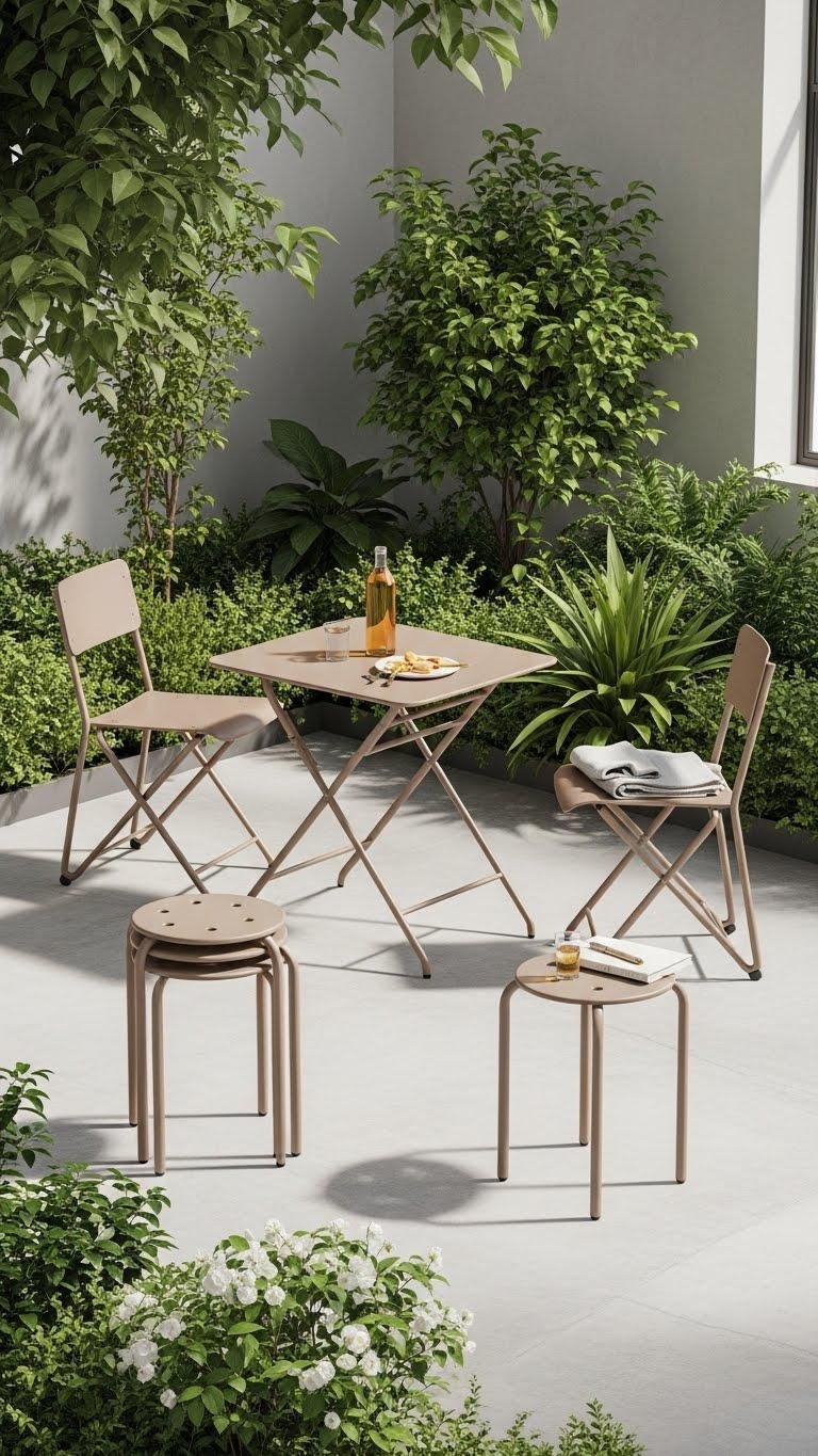 Go for a foldable bistro set that tucks away, or lightweight stackable stools you can move like a breeze.