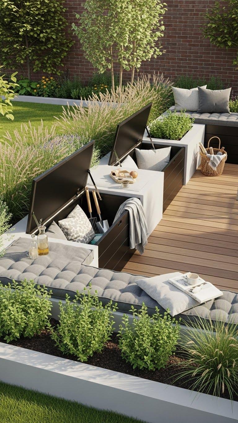 By carving seating into a border wall or decking, you’ll gain neat bench space that doubles as hidden storage for cushions, tools, and pots.