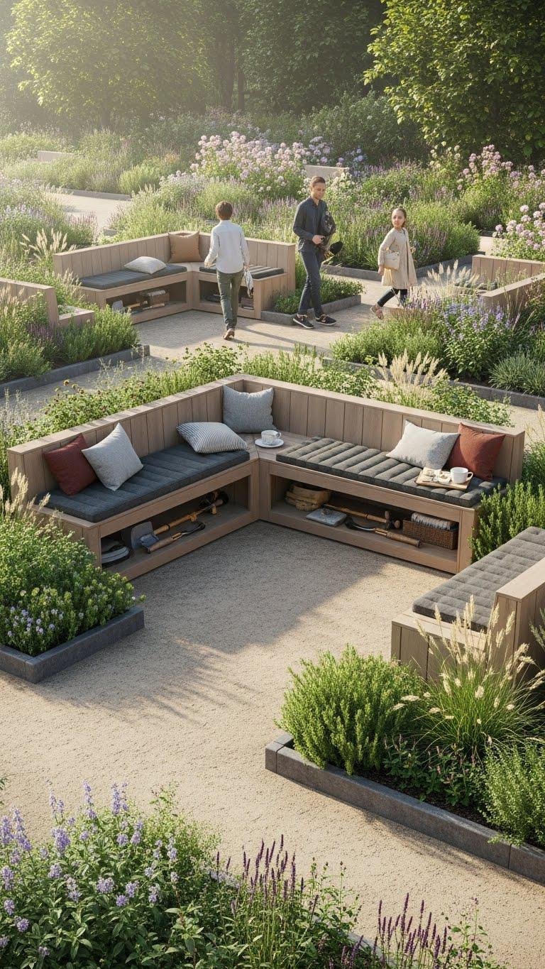 Built-in benches free paths, frame planting beds, and keep tools tucked away so you can move and breathe easily.
