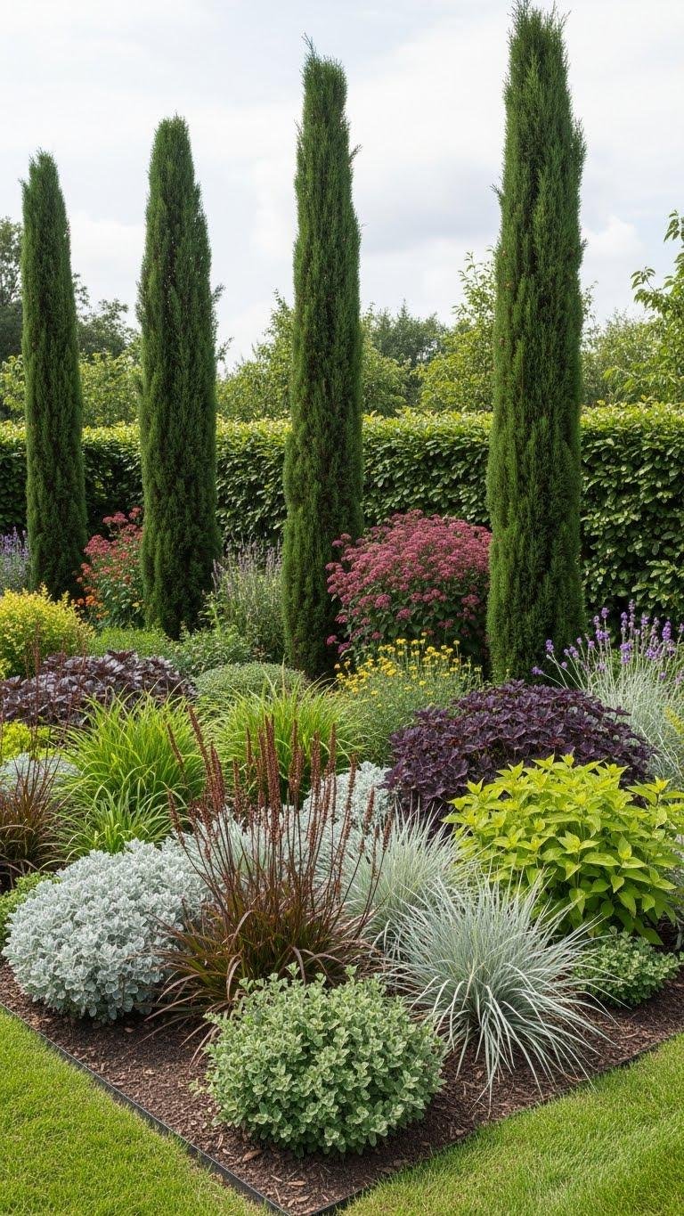Plant pillar hollies for year-round screens and narrow form; use Italian cypresses to draw the eye skyward. Place them where they frame paths or corners, prune minimally, and let tall, slim silhouettes create airy structure.