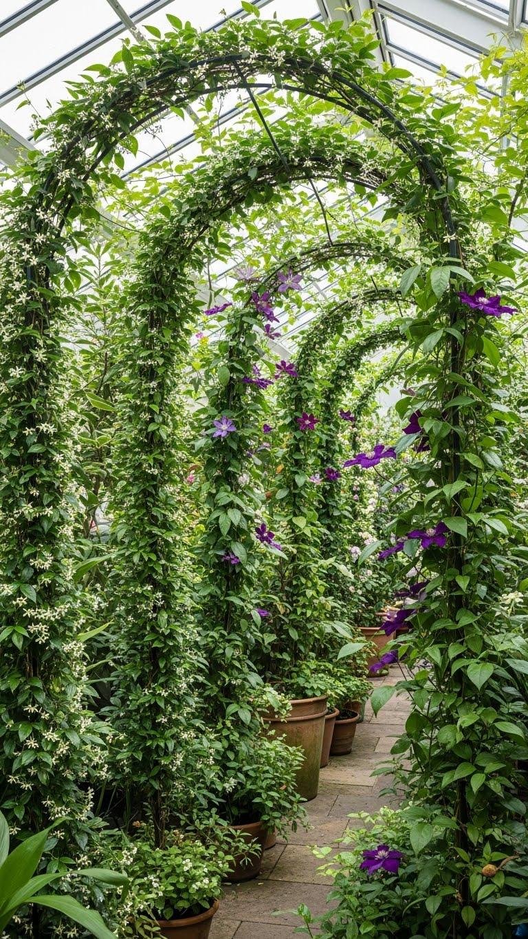 Secure stems to aerial support, prune for shape, and choose fast, fragrant varieties. This creates layered sightlines, maximizes light, and lets you move freely through a taller, greener room.