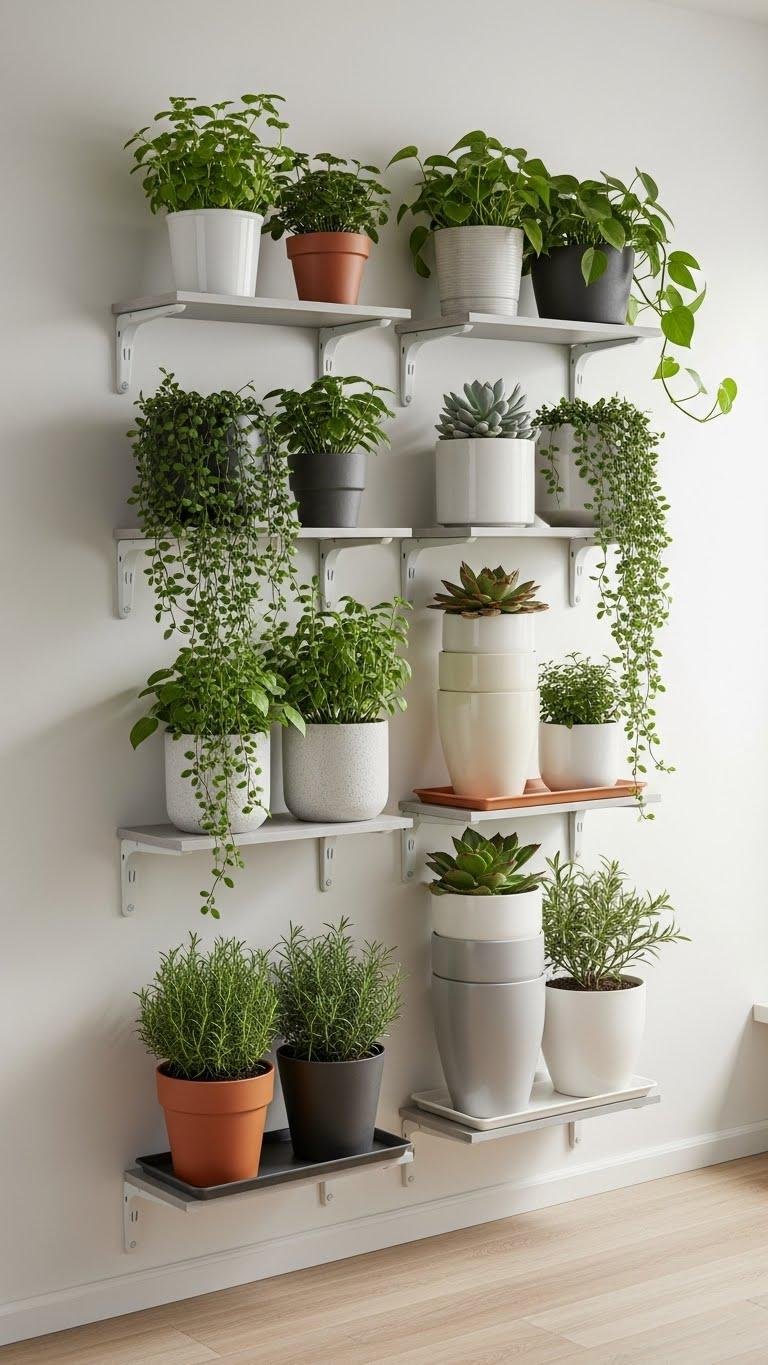 You’ll use narrow ledges and lightweight brackets for secure vertical potstacking, arranging herbs, succulents, and trailing vines.