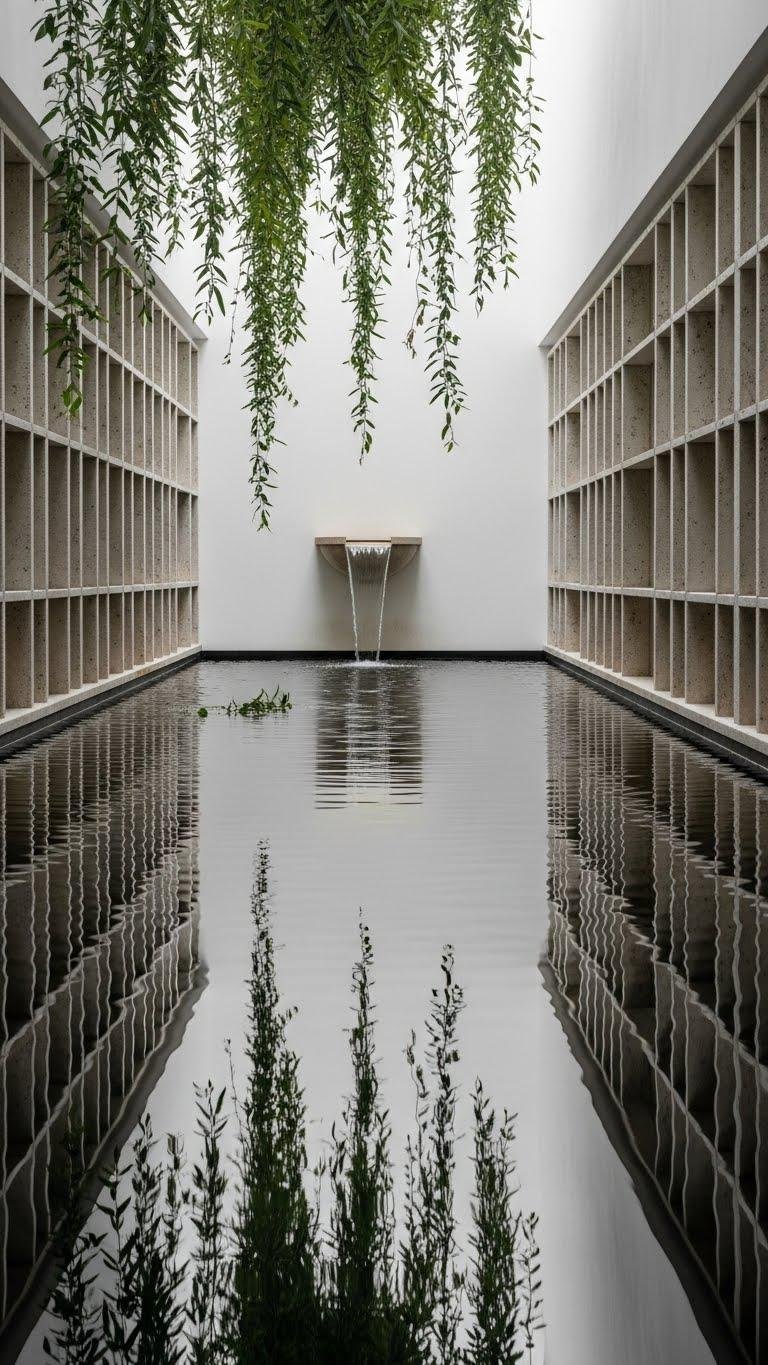 After you’ve freed up floor space with narrow shelving, a slim water feature can anchor the area without overwhelming it — think a tall, narrow fountain or a wall-mounted basin that echoes the vertical lines you’ve already created.