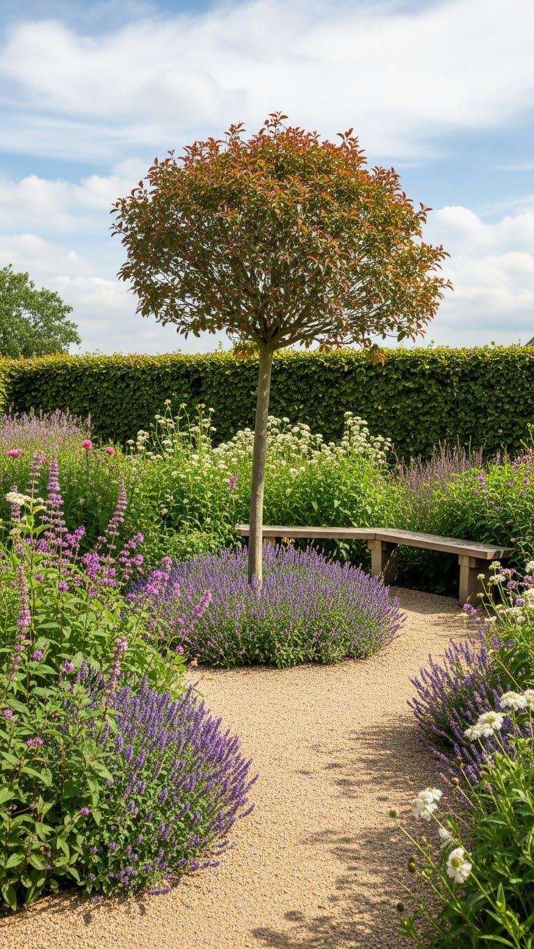 Line beds with pebble edging to define edges. Choose scented hedging and low perennials to free up visual weight, attract pollinators, and provide privacy without crowding. Plant in layers for texture and easy maintenance.