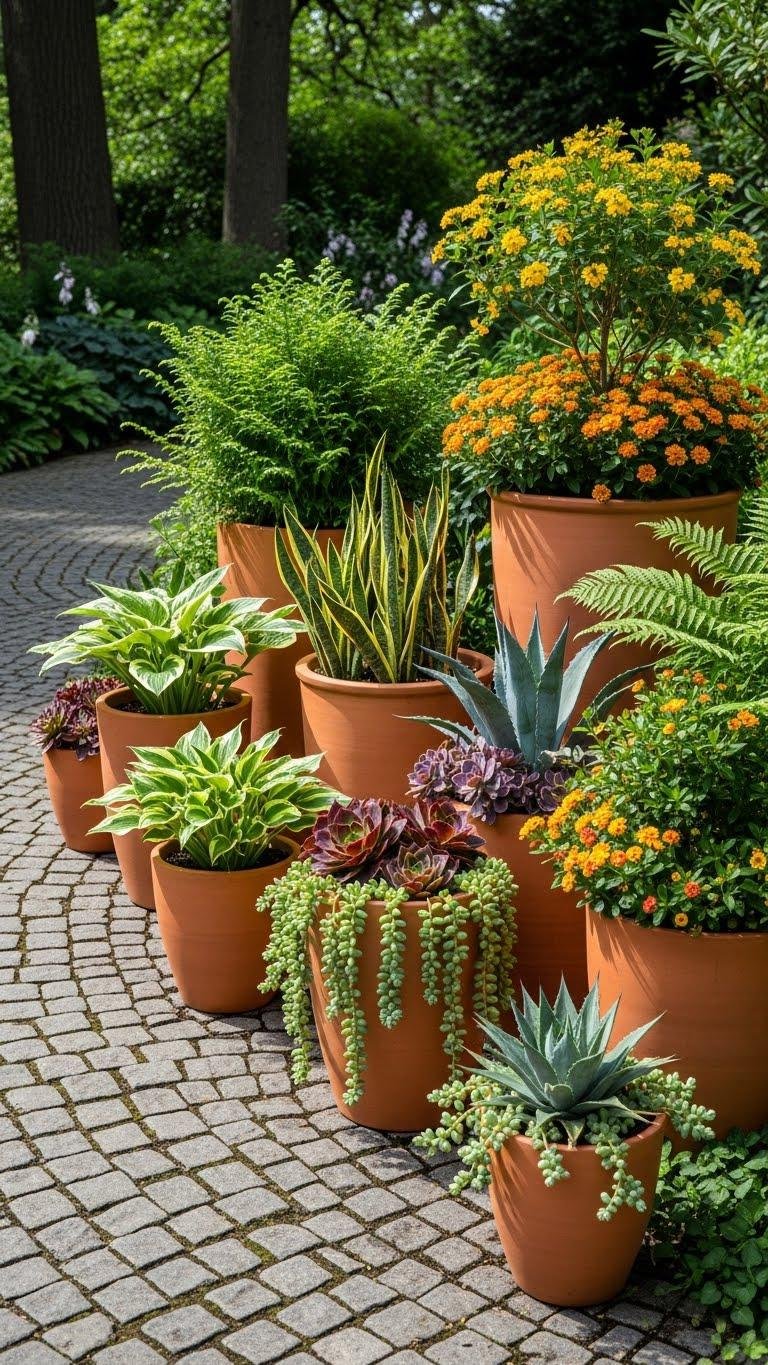 Often you’ll find that repeating a single pot style—same color, material, or shape—ties disparate plantings into a cohesive whole, so line up two or three of those matching containers along a path, patio edge, or stagger them at different heights to create rhythm.