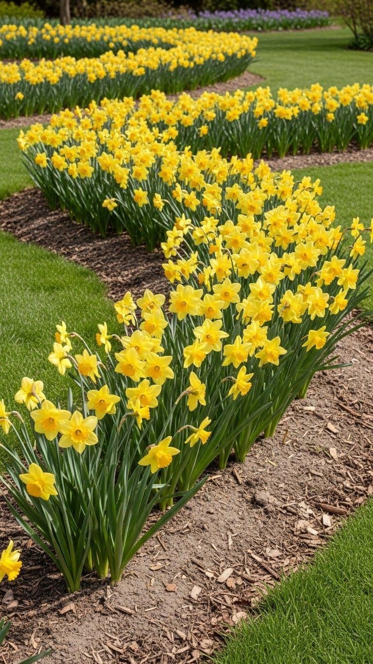 Think with respect to drifts rather than single bulbs: plant daffodils en masse in flowing groups to create early-season color that looks natural and fills beds efficiently.