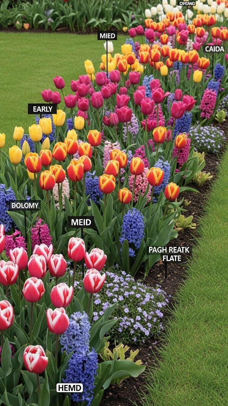 Design a tulip mix border that delivers weeks of color by staggering varieties with different bloom times, heights, and flower forms.