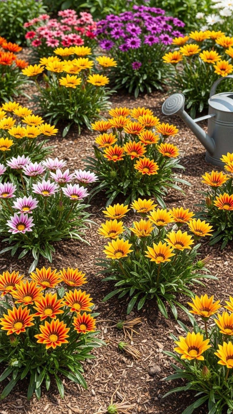Warm-season perennials like gazanias bring sustained color through summer heat, so plan beds and containers around their low, sun-loving habit and fast, repeat flowering.