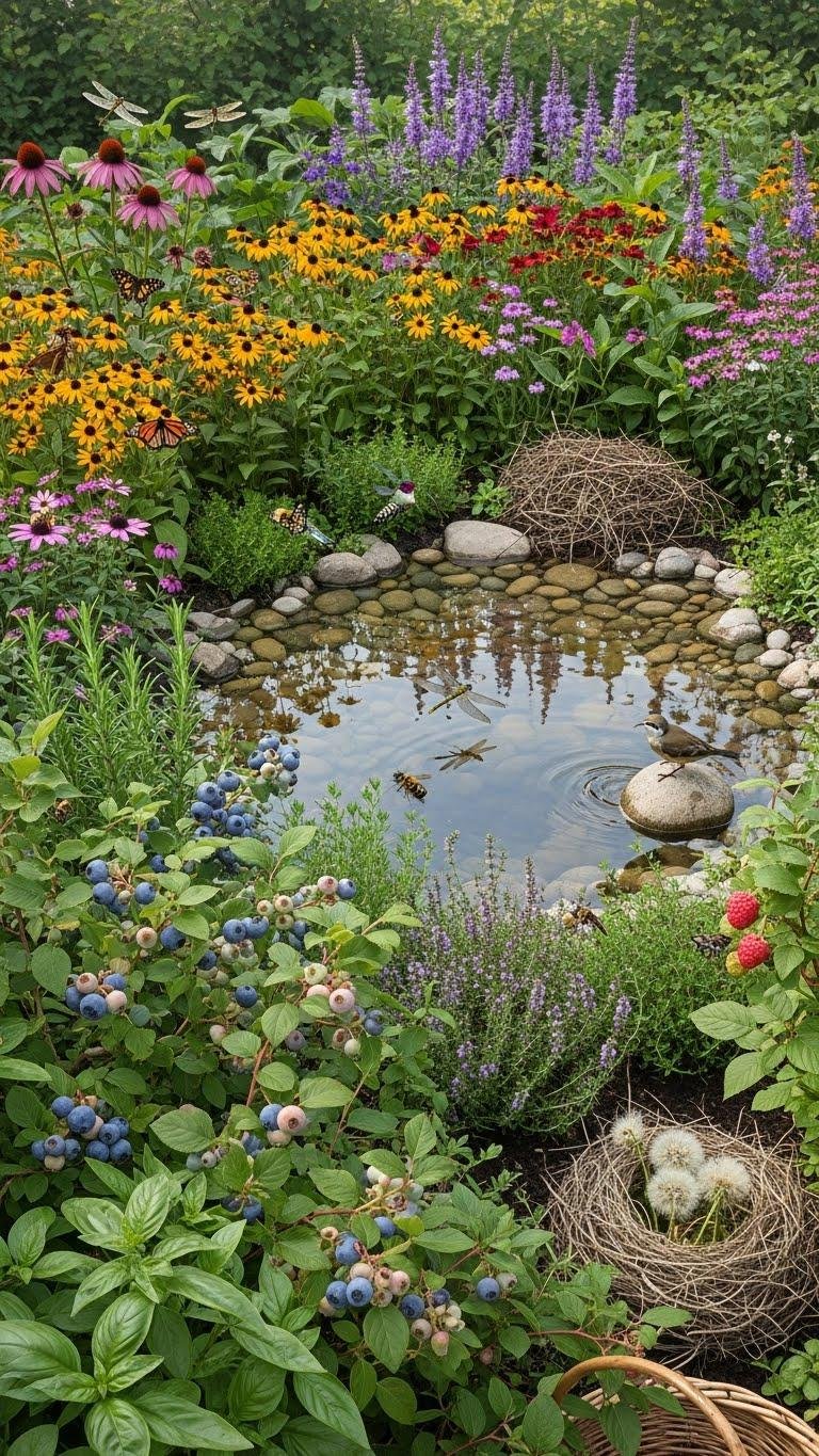 Design an edible hedgerow for fruit, herbs and shelter, place a modest wildlife pond with shallow edges, add native nectar sources and nesting materials, and maintain minimal intervention so ecosystems flourish while you harvest and enjoy freedom.
