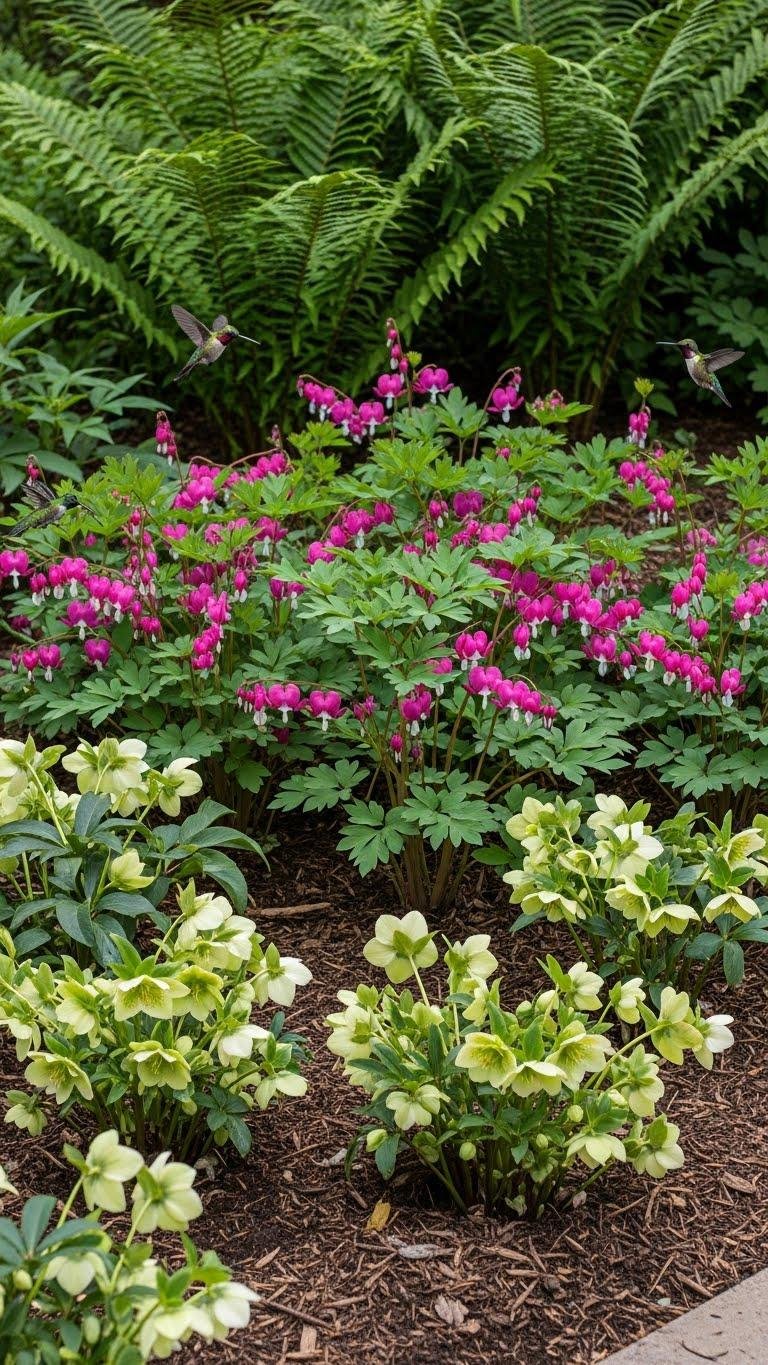 For a cool, shaded corner that blooms from late winter into early summer, plan a mixed bed of hellebores and bleeding hearts that balances form, foliage, and seasonal succession.