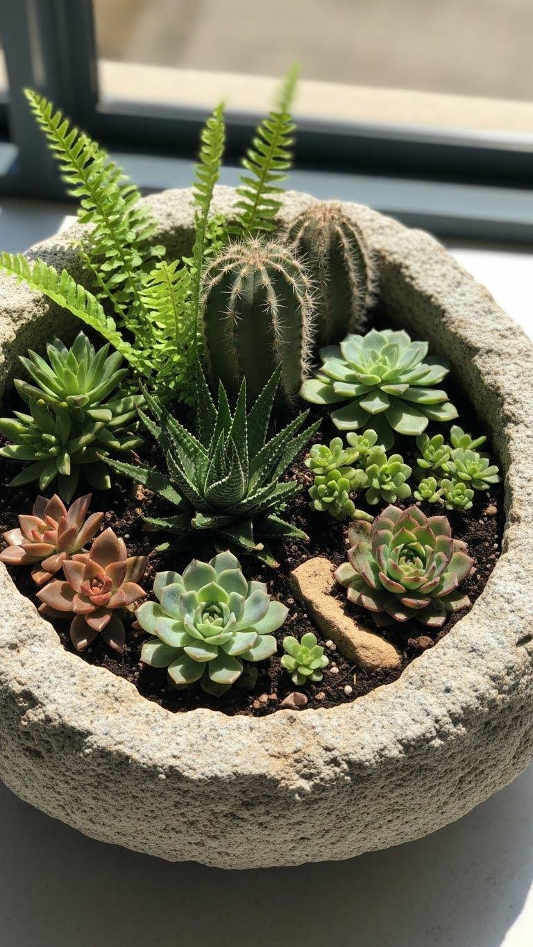 Hollow out a chunk of granite or limestone to create a low-maintenance planter that highlights the textures and shapes of succulents and ferns; the stone’s thermal mass helps regulate soil temperature while its porous surface provides natural drainage.