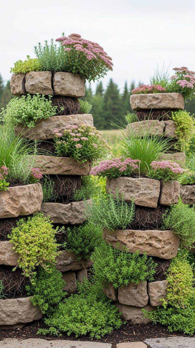 You’ll create stacked planters that showcase trailing sedums, herbs, and dwarf grasses. Arrange rustic towers in clusters for wind-swept silhouettes, leaving gaps for roots and drainage so plants thrive with minimal fuss.