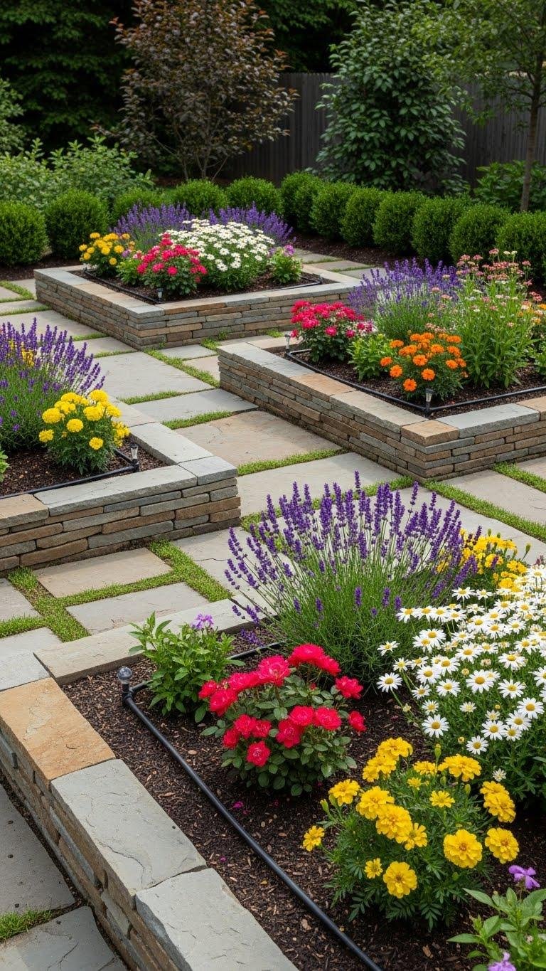 Because elevating your beds lets you play with height and soil depth, multi-tiered rock gardens create pockets where different plants can thrive together without competing for the same conditions.