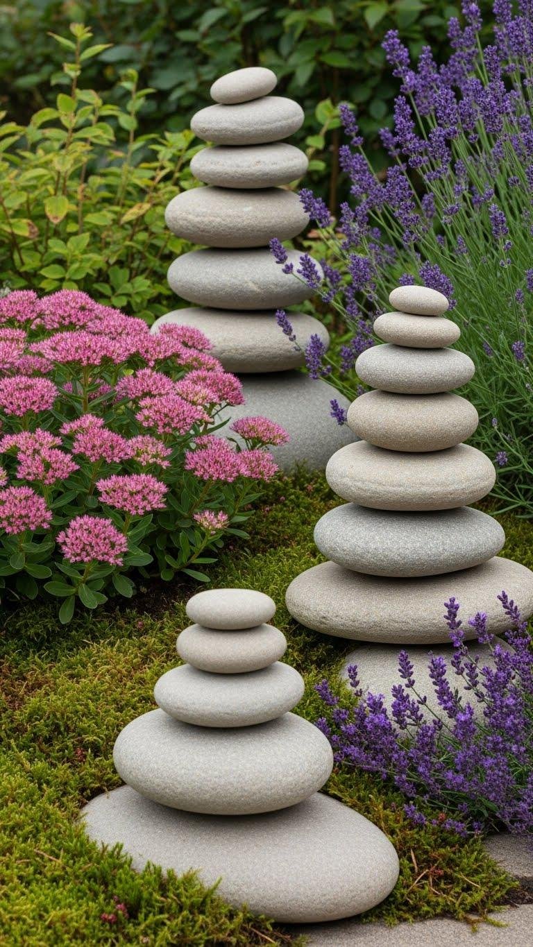 Stack smooth, flat stones into simple cairns or elegant balanced towers to add vertical interest and gentle focal points among plantings. You’ll place stacked cairns near moss, sedums, or lavender to lift beds without crowding roots.